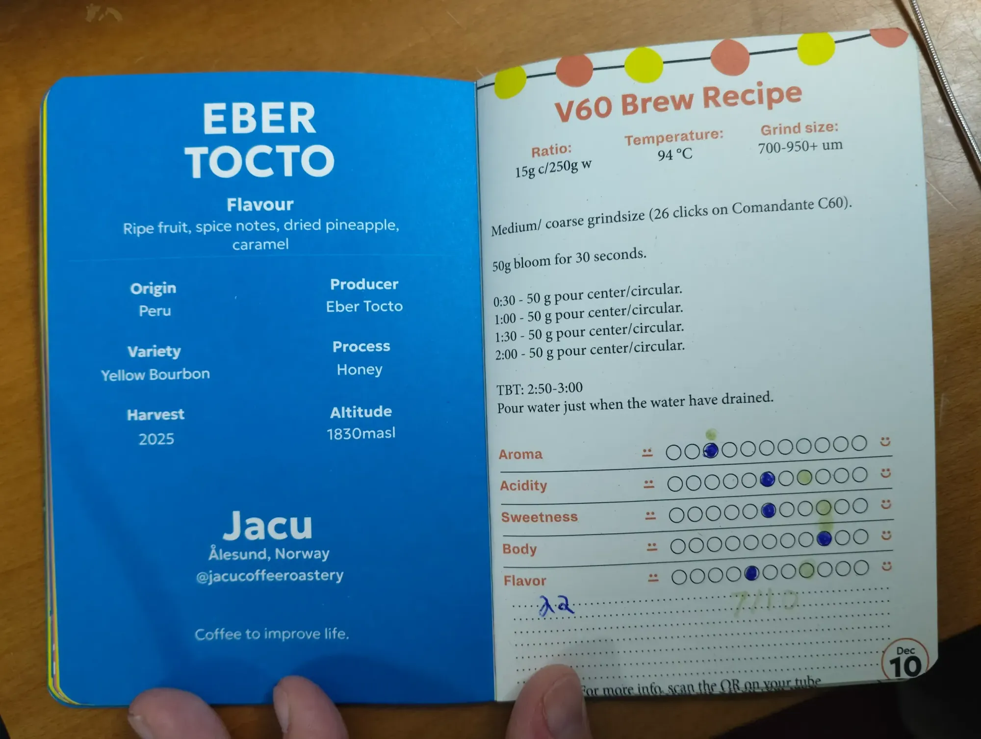 It's a yellow bourbon, a honey process, 1830 meters over sea level, and it's roasted by Jacu up in Norway.