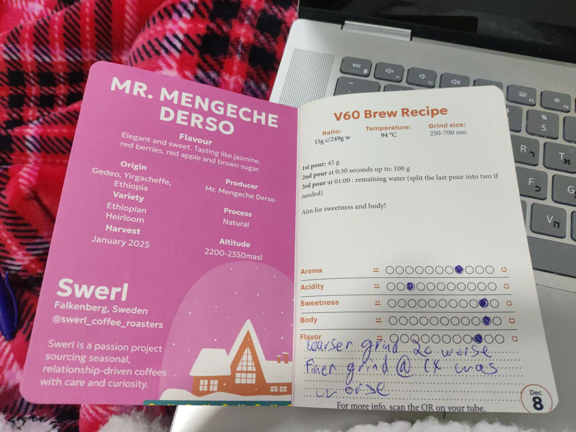 Today is day 8 of the Cafe Box Advent Calendar. Today we're brewing Mr. Mengeshi Durso, which is an Ethiopian Yirgacheffe, natural process from Swerl.